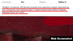 - "Телефон состояниш 100 фоизай пачкаай ягон царапина надора. Документош хаст. Ламинатш тока трешина дора 5 сумда алишш мекни абача) Кадоме харидор боша, занг занен".